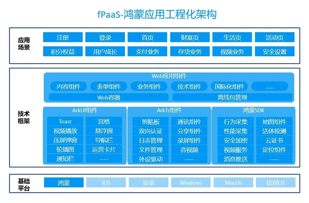 fPaaS平台围绕开发、运行、运维与运营提供了一揽子解决方案,基于鸿蒙ArkUI与ArkTs技术栈构建完整的技术组件与SDK服务,在技术组件、开发工具、运维套件、运行套件及运营套件全方位对鸿蒙进行了全面的适配。客户与交付团队能够基于此平台,对存量业务层功能快速迁移,对业务与技术实现零侵入。